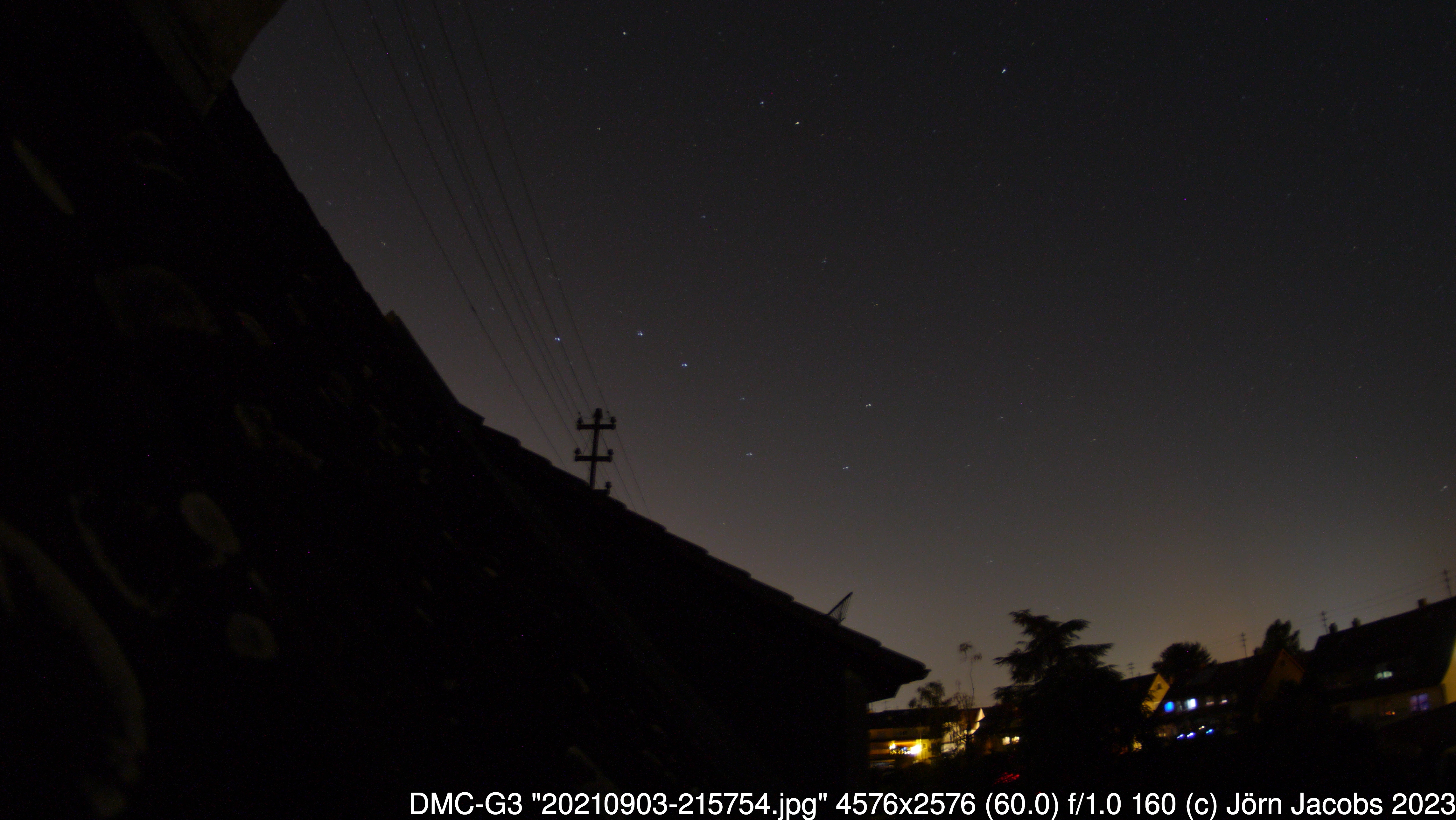 A23 Kamera: DMC-G3, Objektiv: SuperWW 8mm (entspr. 16mm wegen crop faktor 2) Entf.: inf. - Blende: F/3.5, VsZeit 60 s, Empf.: 160 ISO. Die Sterne sind etwas "länglich", der Grosse Wagen und der Kleine Wagen sind gut zu erkennen.