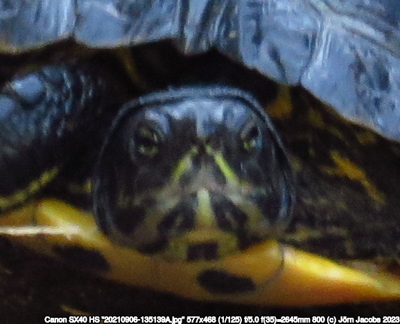 A27 Antlitz unserer Schildkröte, stark herausvergrössert. Durch ungünstige Lichtverhältnisse unscharf, sollte deshalb wiederholt werden, am besten mit offenerer Blende und/oder höherer ISO-Zahl; beides war hier nicht möglich. Kamera für diese spezielle Aufnahmesituation nicht günstig: Canon PowerShot SX40 HS, Objektiv: Brw.: 65.7 mm Entf.: 4.45 m Blende: F/ 5.0 , VsZeit 1/125 s, Empf.: 800 ISO