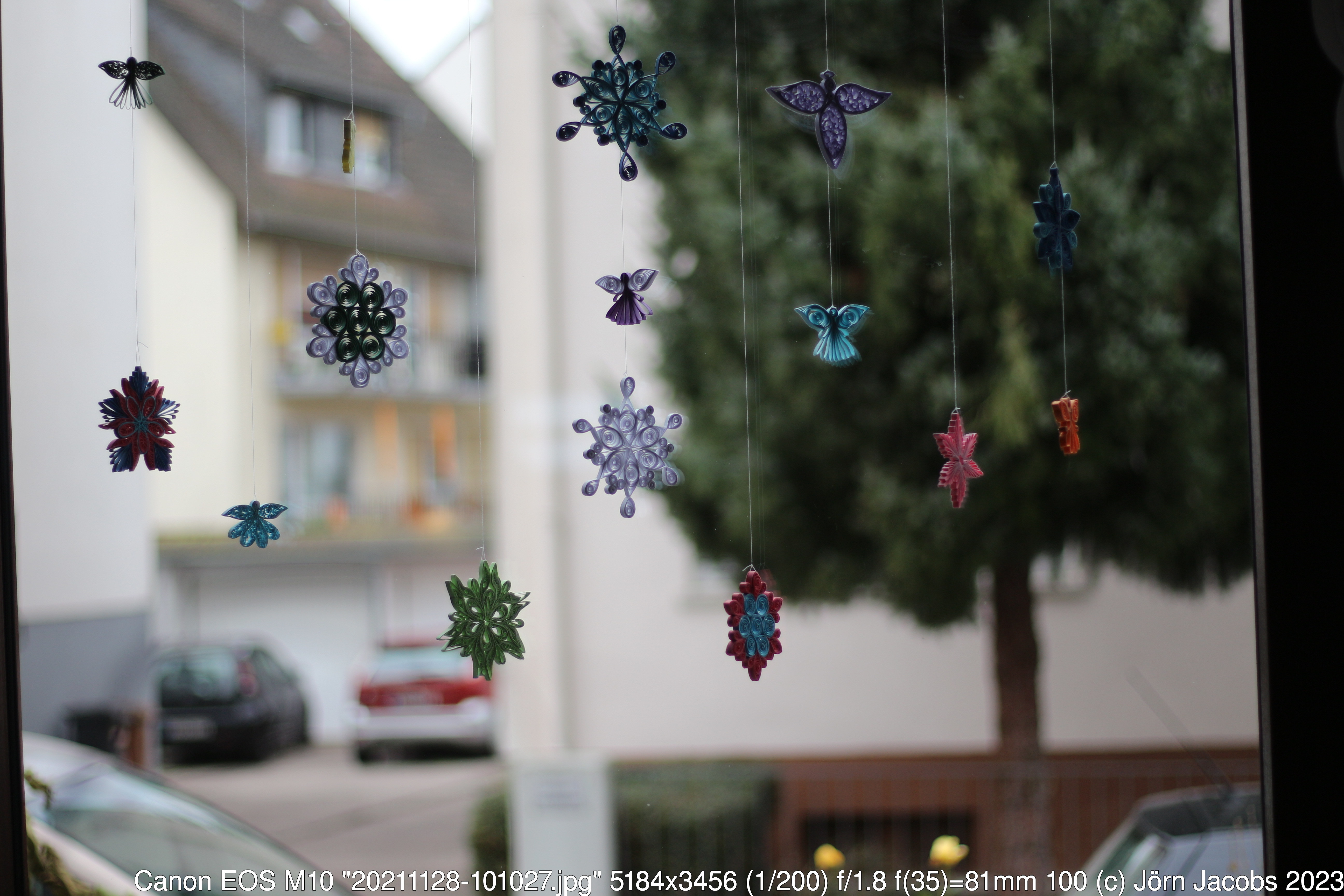A33 Absichtliche Hintergrund-Unschärfe: Ansprechender Fensterschmuck vor hässlich-trivialer Bebauung. Kamera: Canon EOS M10, Objektiv: Brw.: 50.0 mm Entf.: 3.5 m Blende: F/ 1.8 , VsZeit 1/200 s, Empf.: 100 ISO