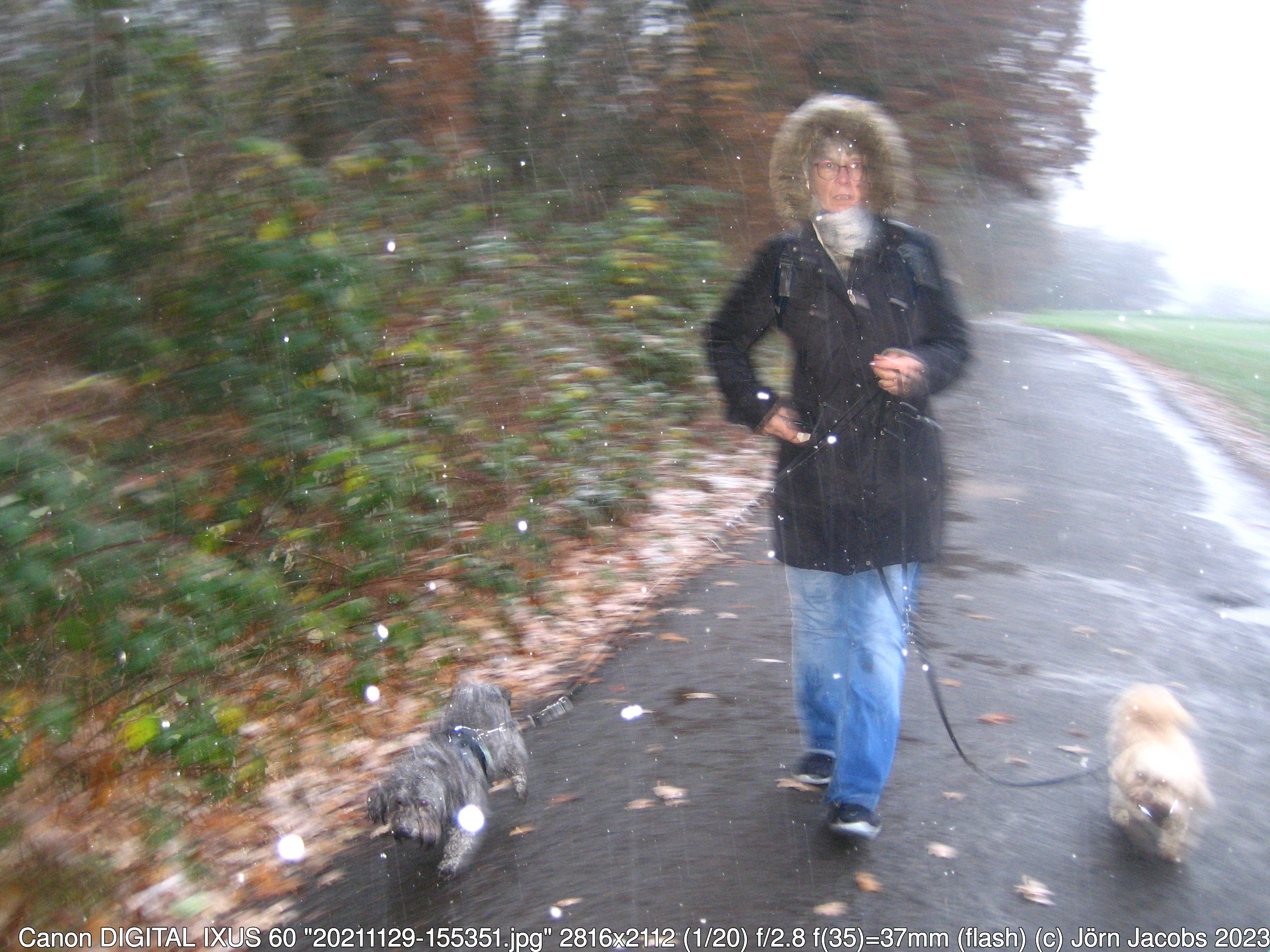 A34 Immer-dabei-Taschenkamera ist auch hier an der Grenze. Kamera: Canon DIGITAL IXUS 60, Objektiv: Brw.: 5.8 mm Entf.:inf , Blende: F/ 2.8 , VsZeit 1/20 s, Empf.: 200 ISO Blitz benutzt. Hintergrund ist Verwackelungs-Unscharf, Schneeflocken im Vordergrund teilweise zu nah, aber durch Blitz scharf festgehalten.