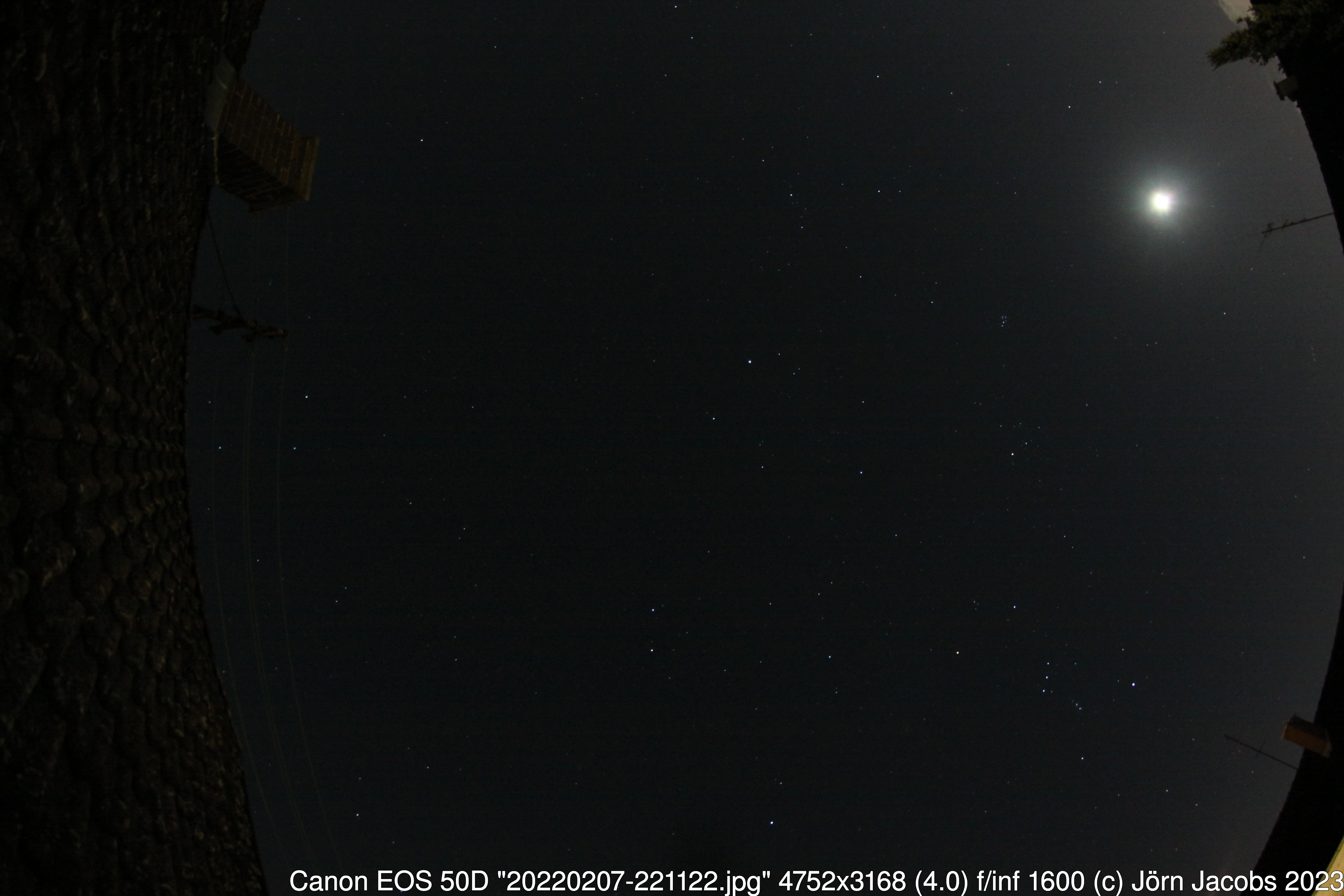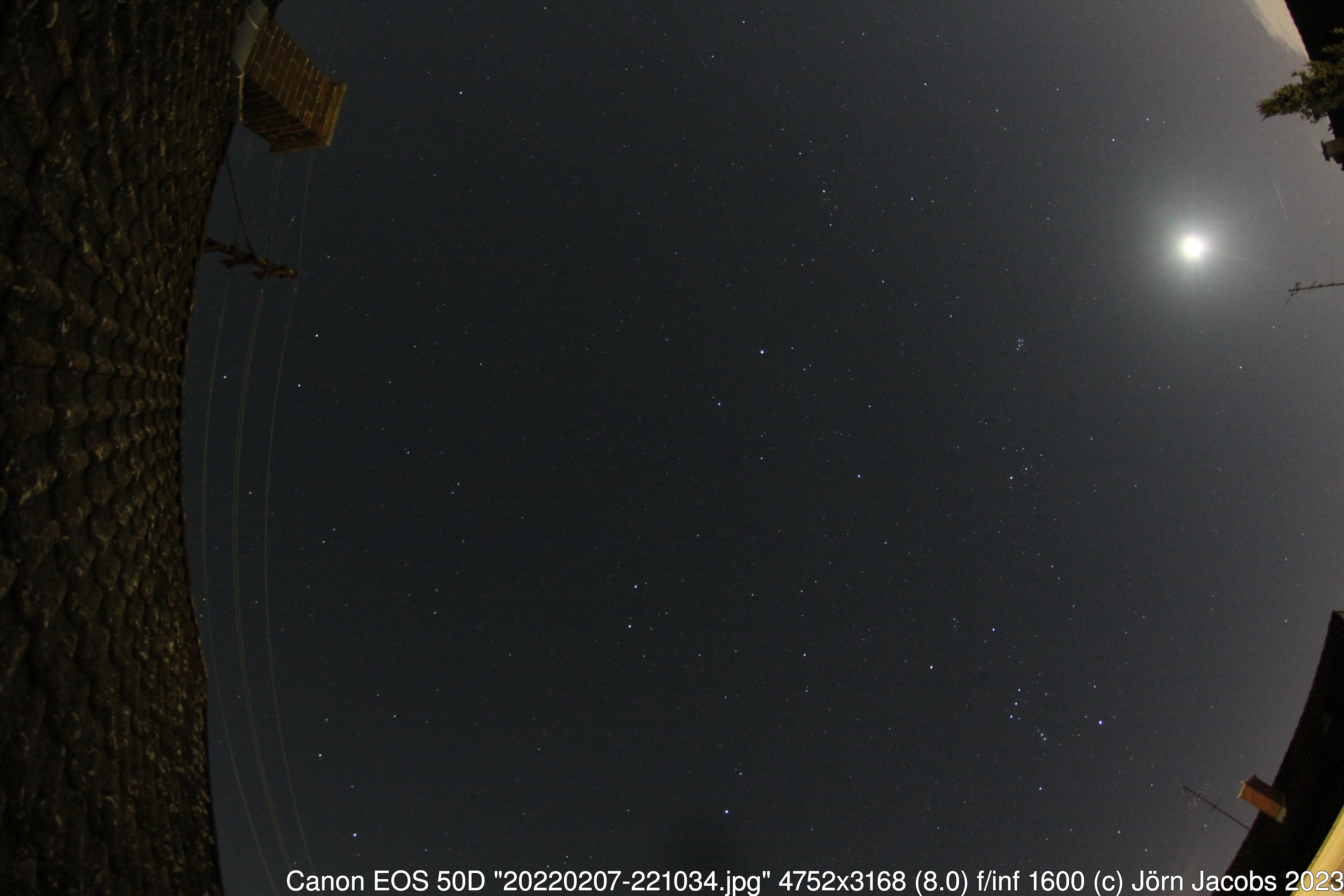 94 N* Sternhimmel mit nach oben gerichteter Kamera: Canon EOS 50D mit Weitwinkelobjektiv 8mm, F/3.5, 8sec, ISO 1600. Das nachfolgende Bild mit 4 sec Belichtungszeit.