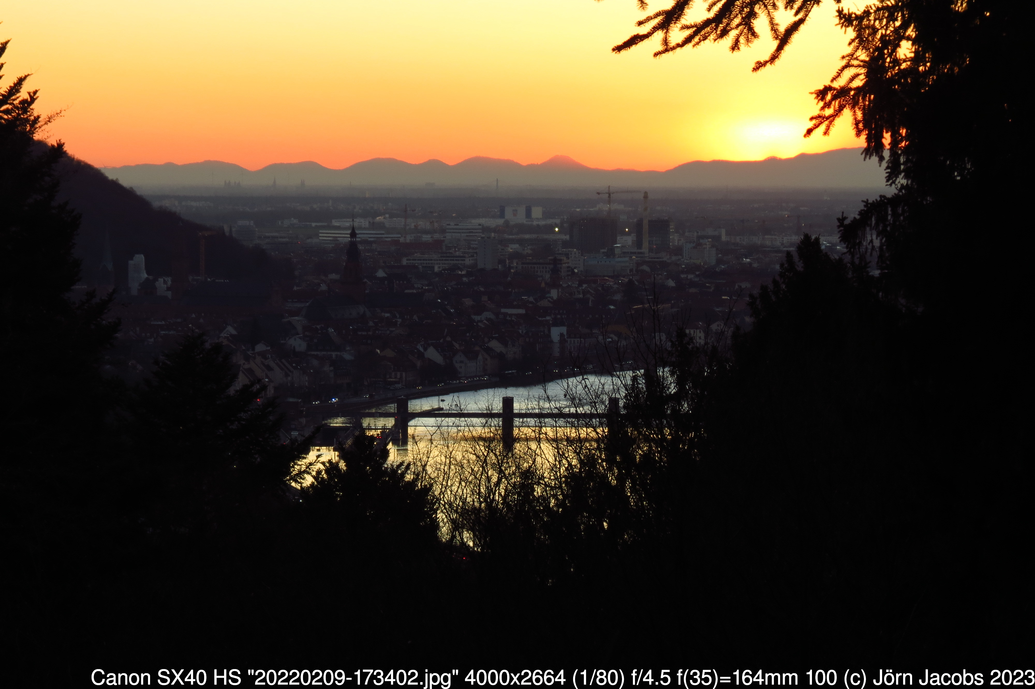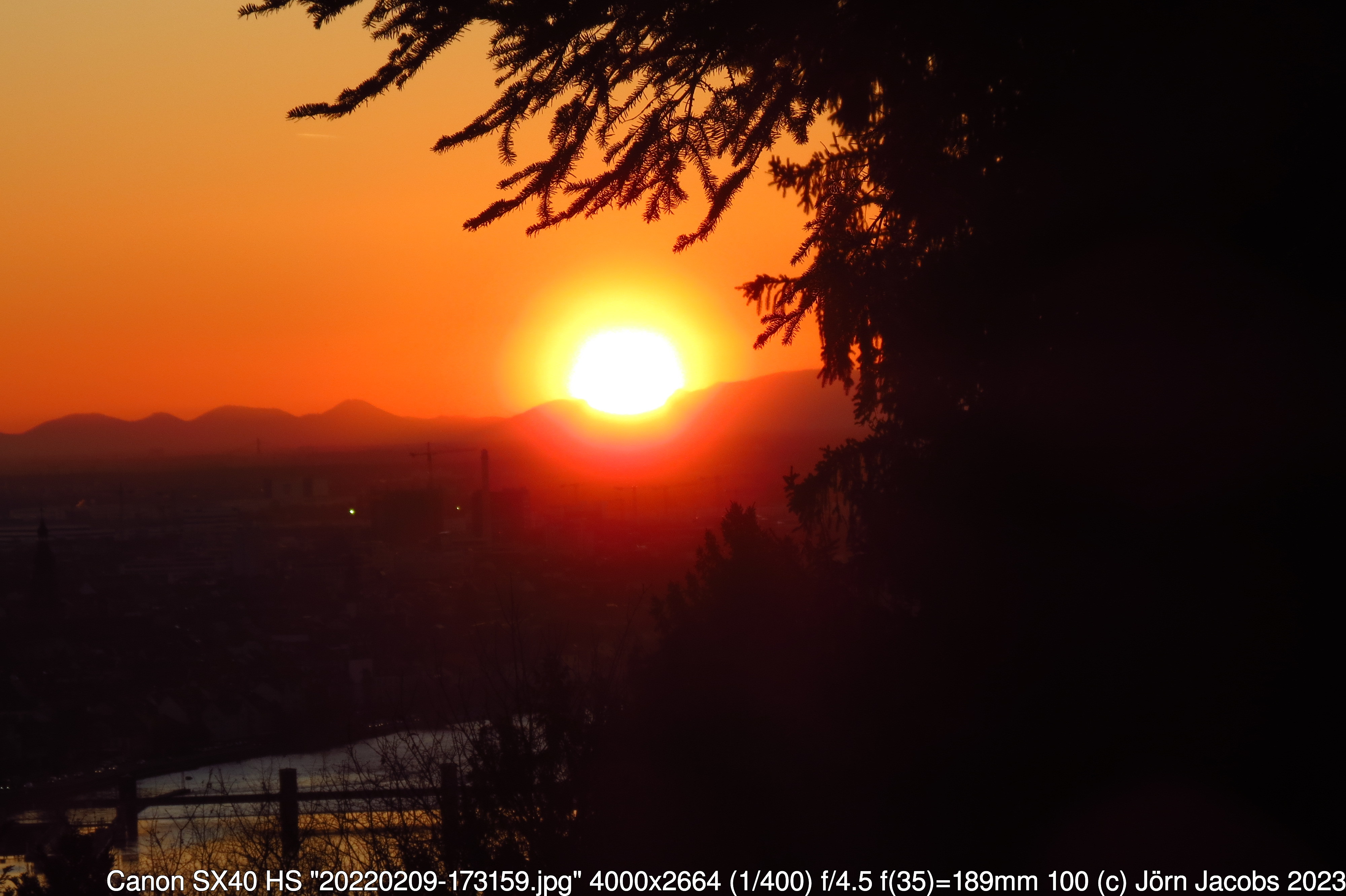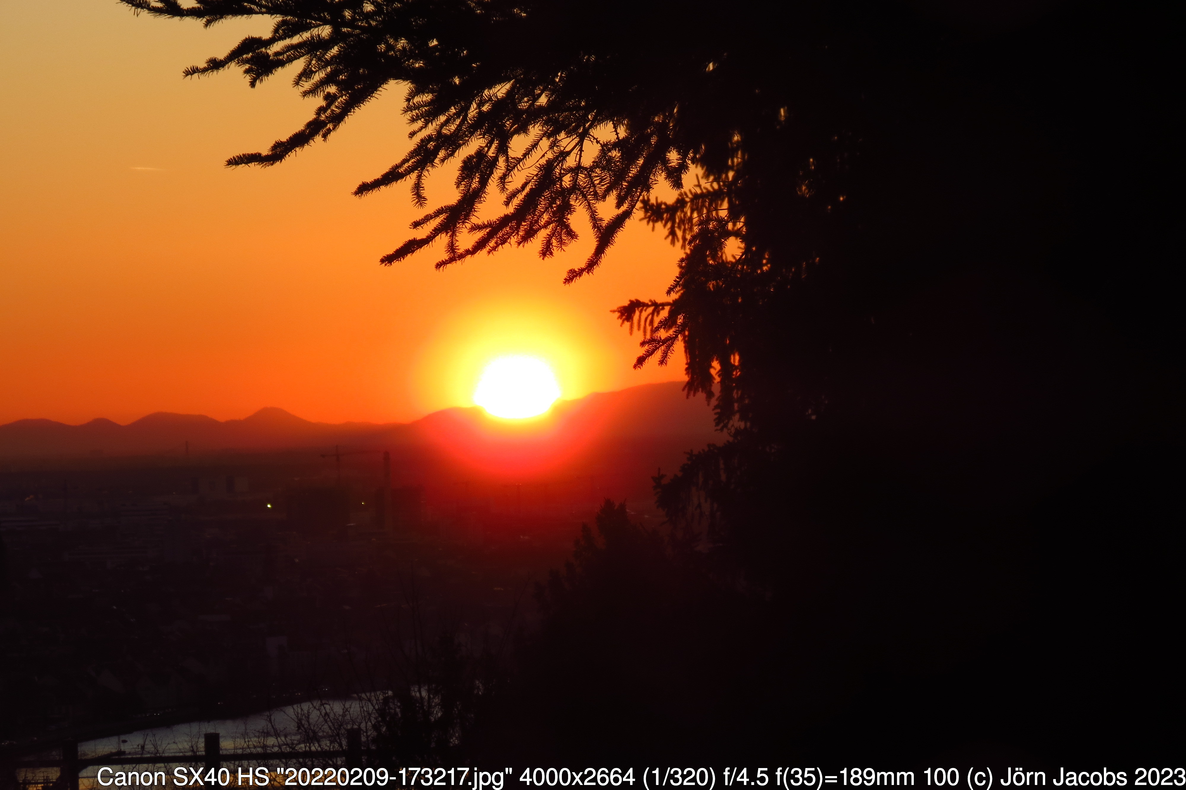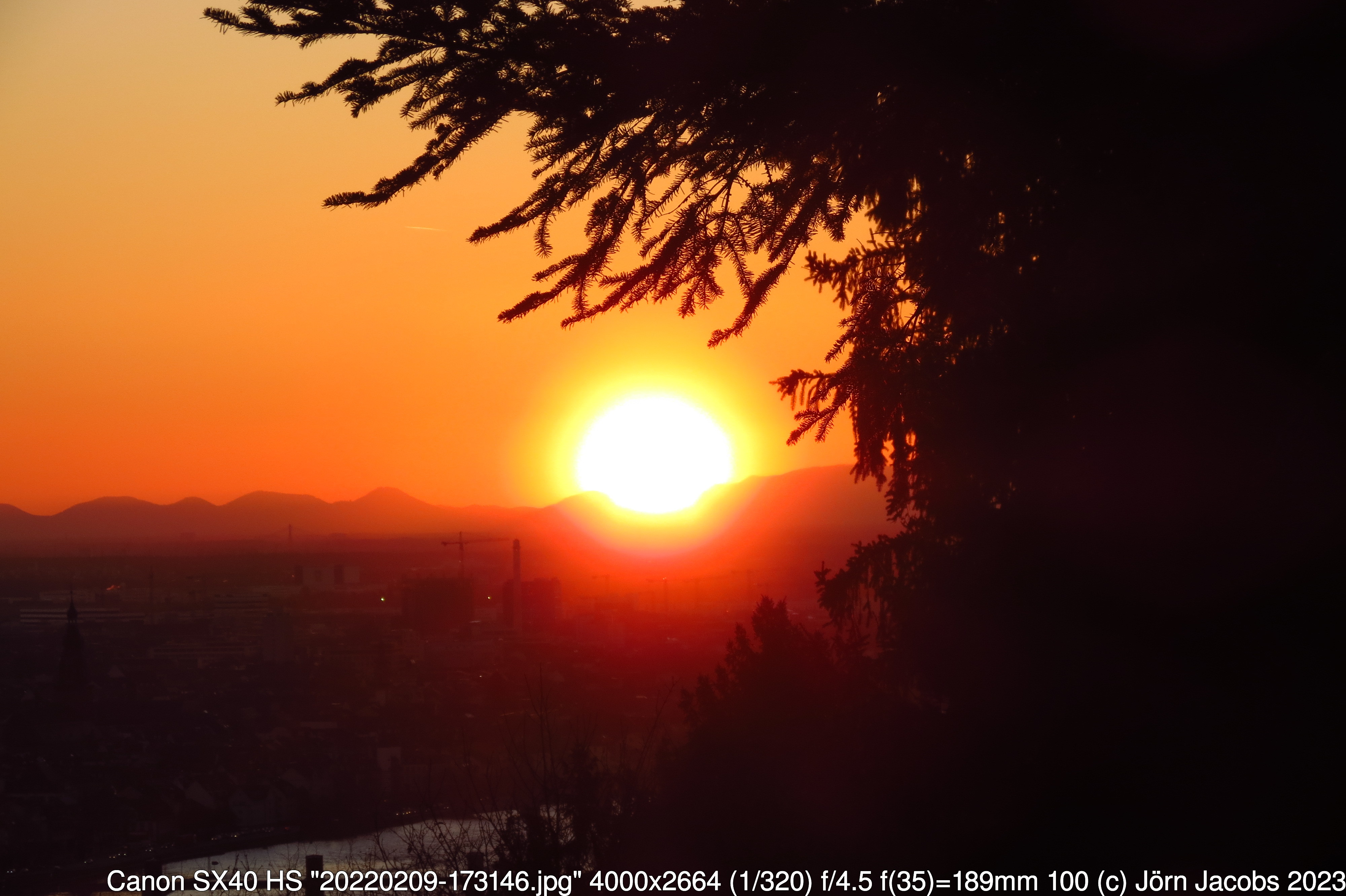 104 N* Zufällig zum richtigen Zeitpunkt am richtigen Ort: Sonnenuntergang über dem Pfälzer Wald, vom Köpfel (NO von Heidelberg) aus fotografiert. . Canon PowerShot SX40 HS 4.3 - 150.5 mm 50.5 mm 10.27 m 8.0 1/2000 ISO 100. Für die folgenden Bilder: Die Belichtungwerte musste man sich von verschiedenen Punkten der Szenerie holen, um die unterschiedlichen Stimmungen entsprechend zu betonen zu können.