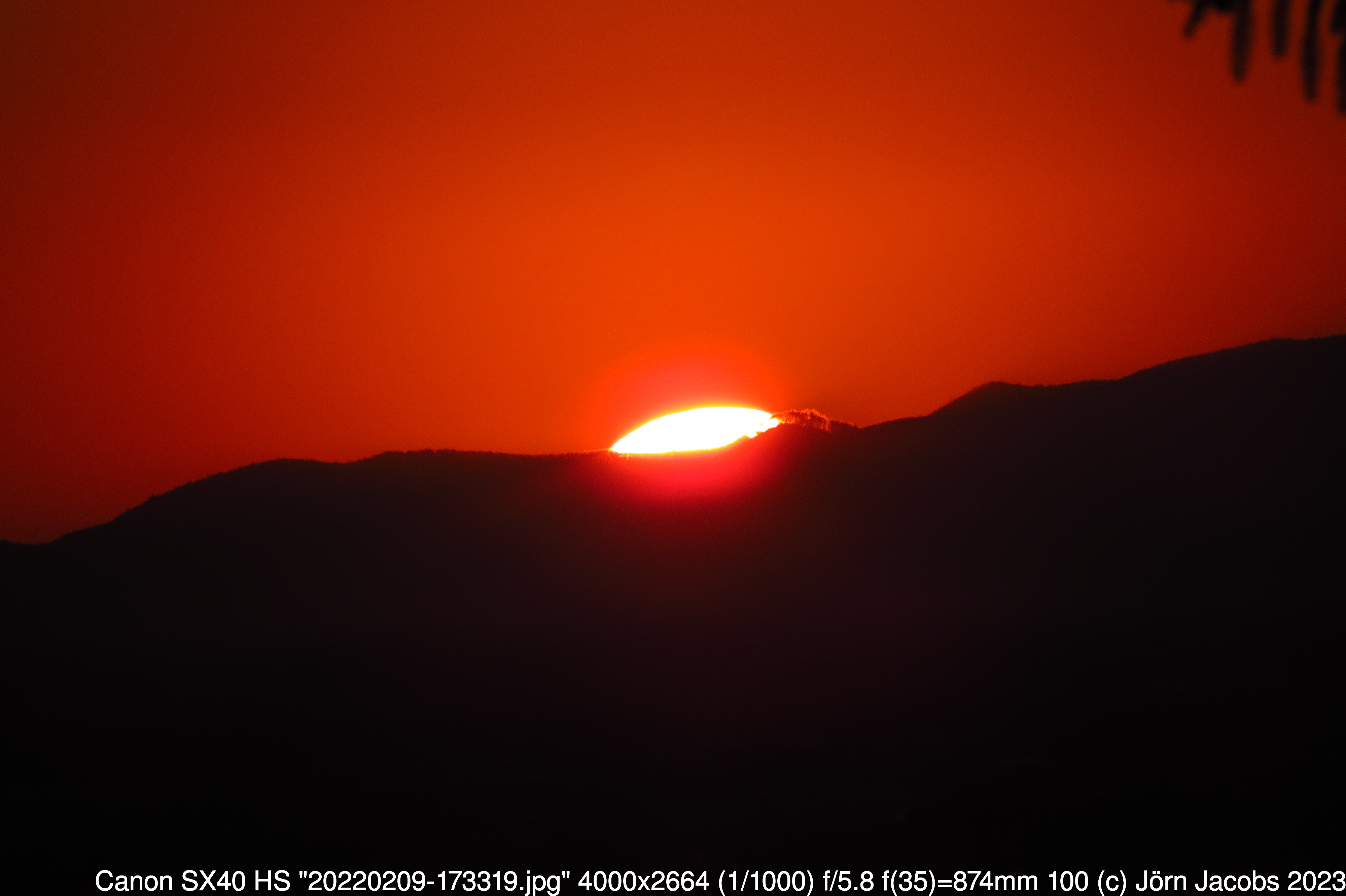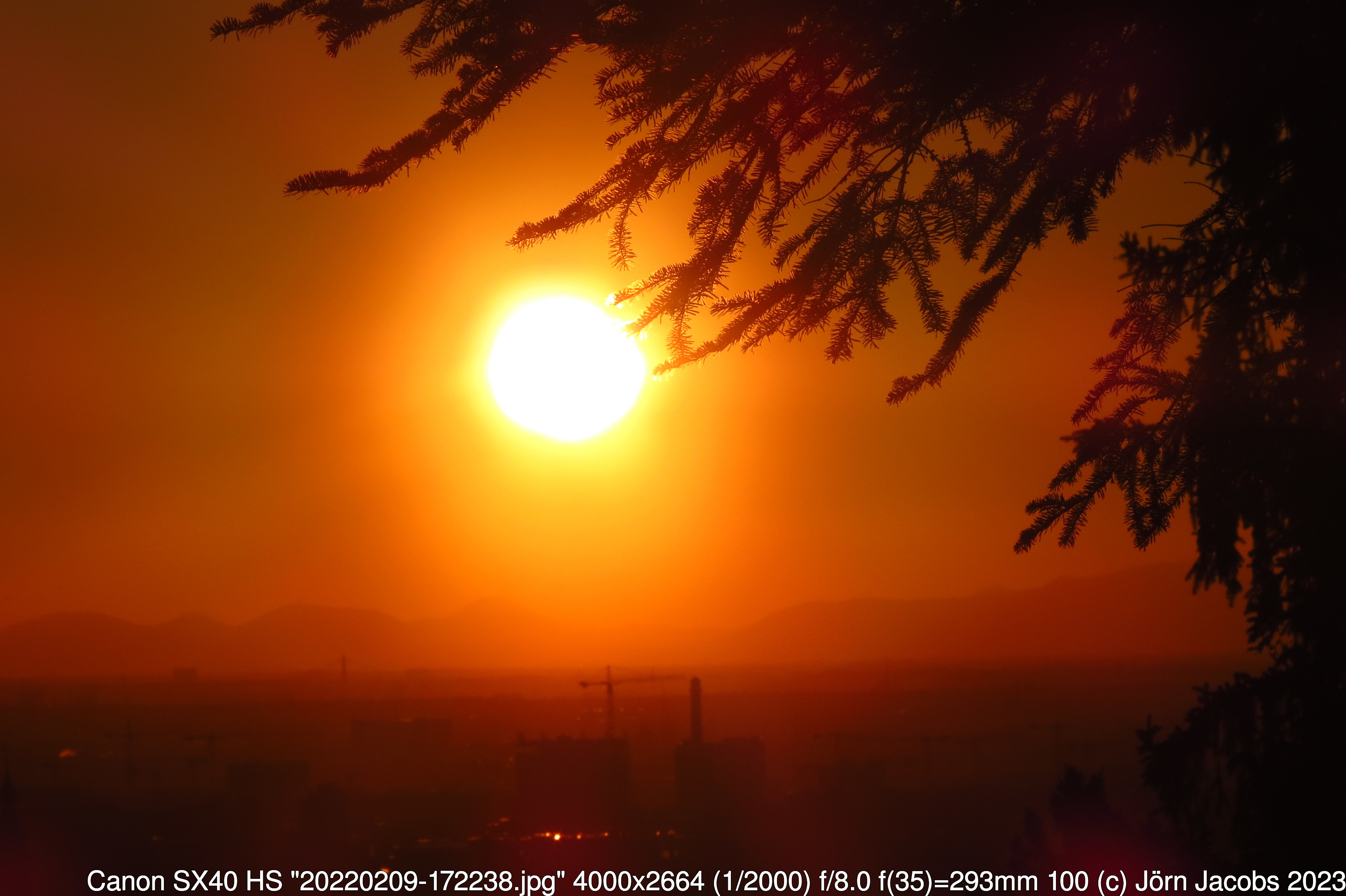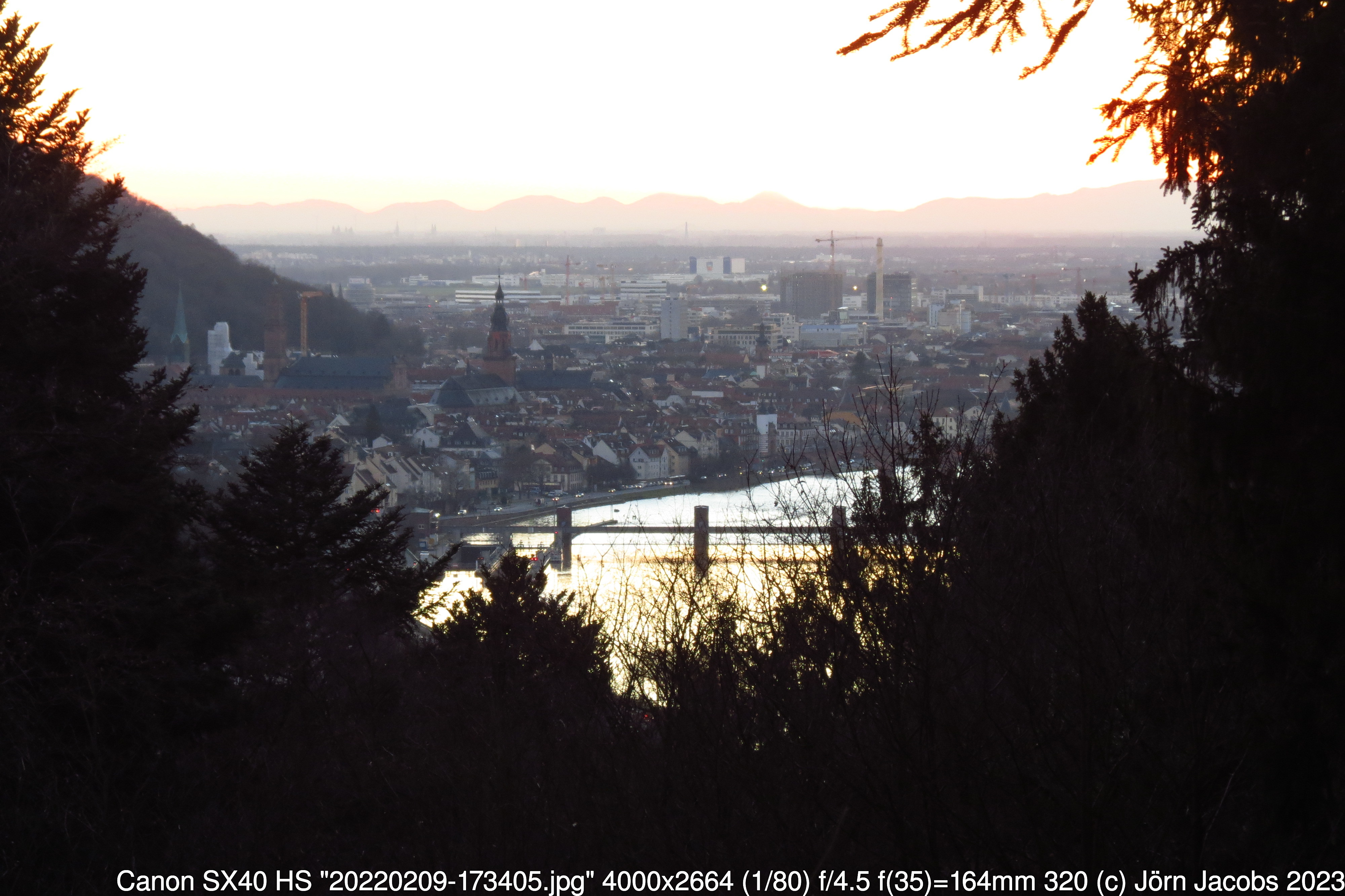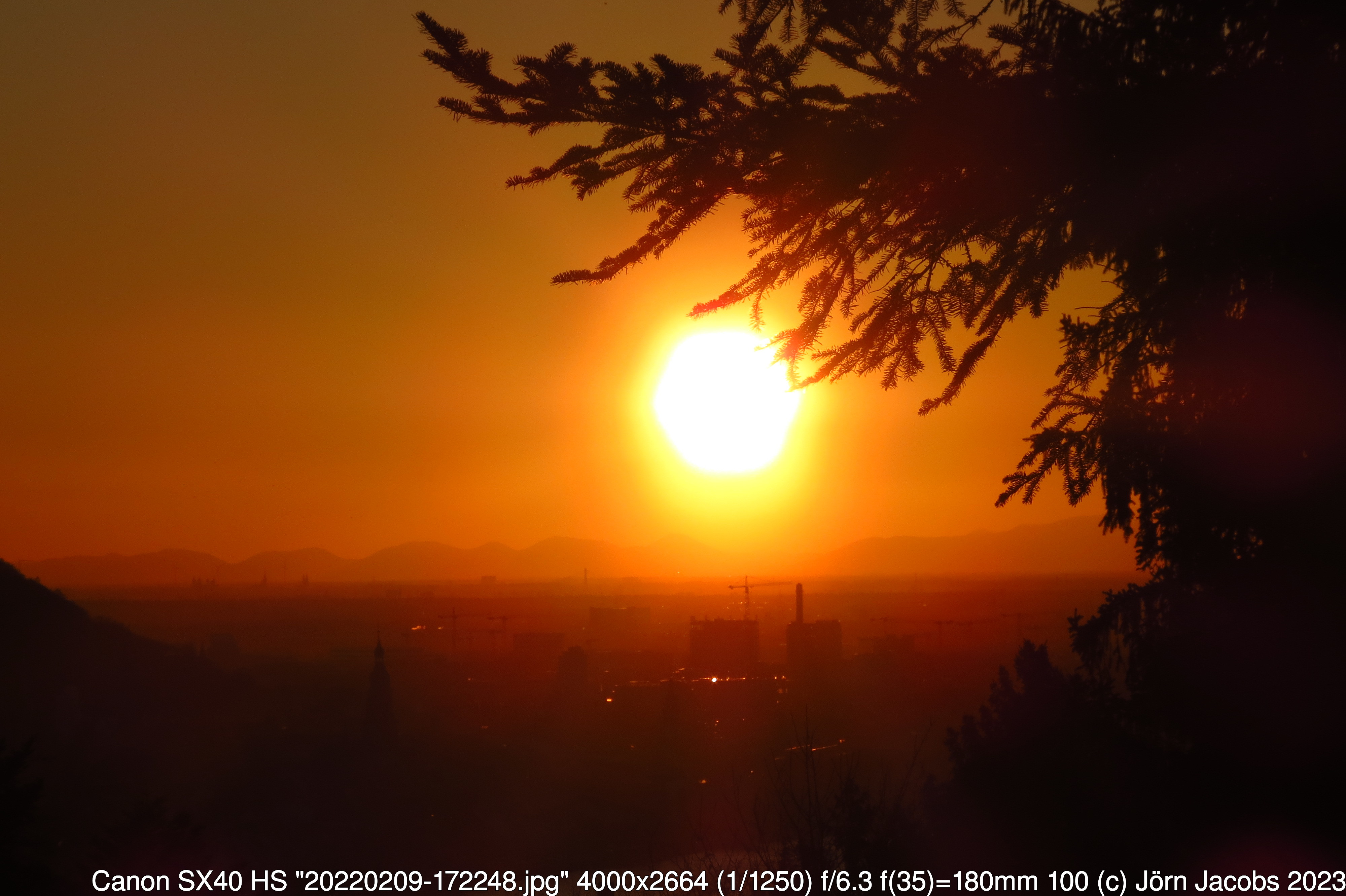 104 N* Zufällig zum richtigen Zeitpunkt am richtigen Ort: Sonnenuntergang über dem Pfälzer Wald, vom Köpfel (NO von Heidelberg) aus fotografiert. . Canon PowerShot SX40 HS 4.3 - 150.5 mm 50.5 mm 10.27 m 8.0 1/2000 ISO 100. Für die folgenden Bilder: Die Belichtungwerte musste man sich von verschiedenen Punkten der Szenerie holen, um die unterschiedlichen Stimmungen entsprechend zu betonen zu können.